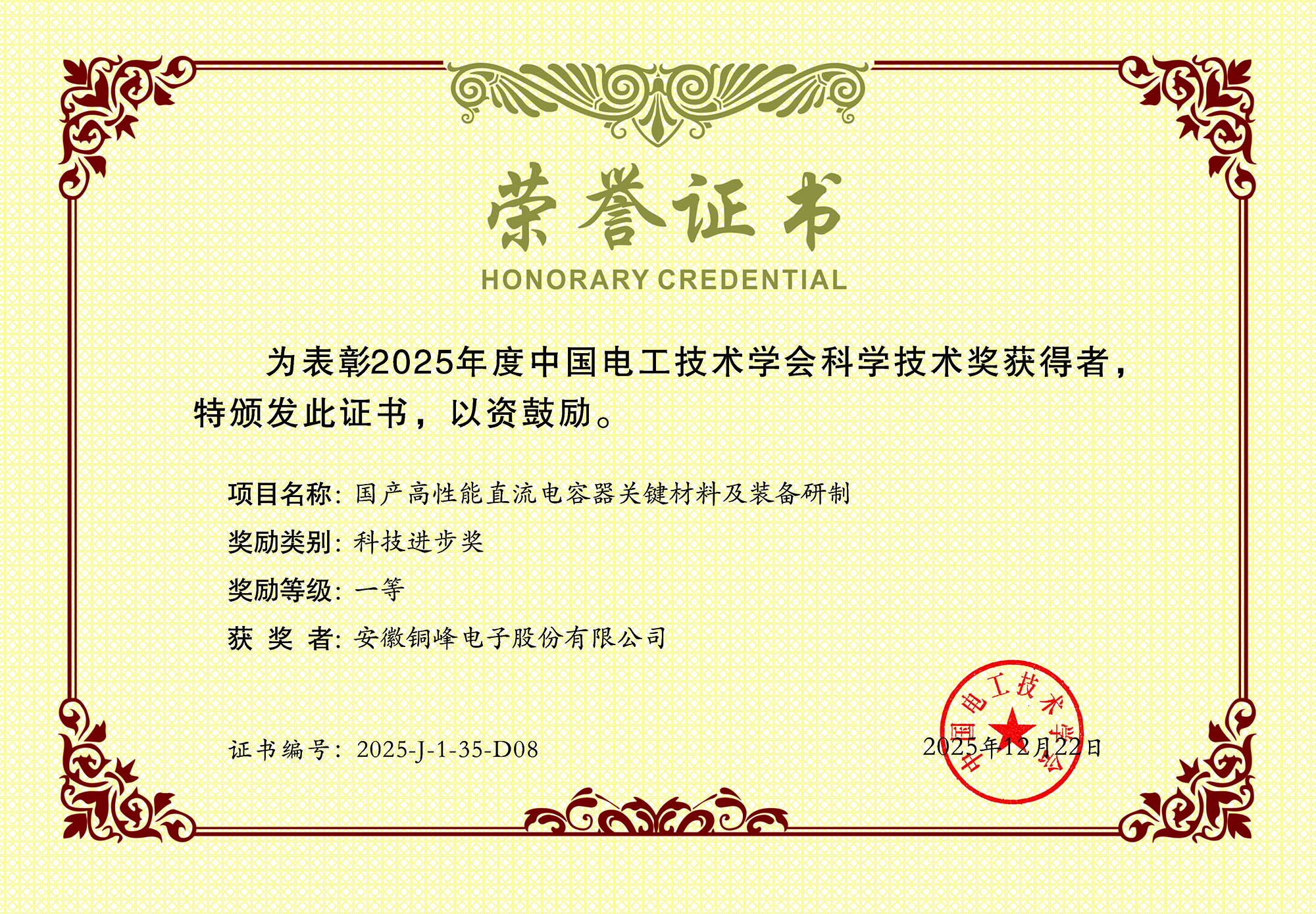 近日,公司參與的合作項(xiàng)目“國產(chǎn)高性能直流電容器關(guān)鍵材料及裝備研制”榮獲2025年度中國電工技術(shù)學(xué)會(huì)科技進(jìn)步一等獎(jiǎng)。